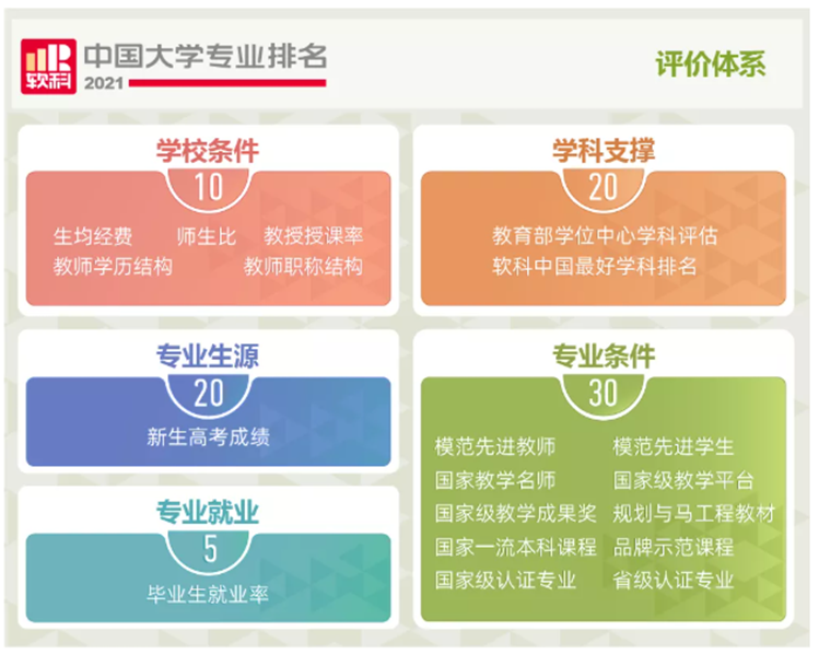 “软科中国大学专业排名”设计了独具特色的专业竞争力评价框架,通过学校——学科——专业三个层次的评价汇总形成对专业的综合评价。排名指标体系设置学校条件、学科支撑、专业生源、专业就业、专业条件5个指标类别,共19项测量指标。“学校条件”考察一所大学的经费收入、团队规模、团队结构、教授授课等学校层面的培养条件,结果用于学校开设的所有专业;“学科支撑”考察专业关联学科的水平和实力,一个学科对与其关联密切的专业均有支撑作用;“专业生源”即专业录取新生的高考成绩,反映了该专业的社会声誉和对员工的吸引力;“专业就业”体现了专业的毕业生被社会认可和接纳的情况;“专业条件”考察本专业的平台、名师、课程、教材等专业层面的培养条件以及本专业获得的各种认证和重点建设情况。