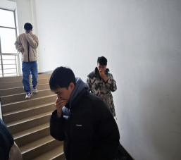 演练开始,模拟学院大楼五楼研究生实验室楼道线路着火,随着橙色消防烟雾散开,师生们发现火情立刻行动,互相通知,各实验室负责人组织撤离,引导师生安全疏散,最终全体师生成功撤离至学院楼前空地。