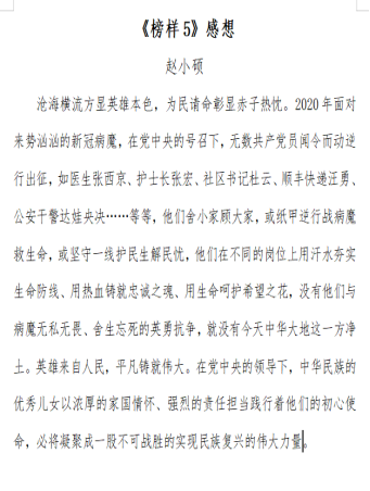 赵小硕在观看专题节目结束后指出,《榜样5》展现了共产党人“不忘初心、牢记使命”的执着坚守,彰显了共产党人“信仰坚定、心系群众、勇于担当、创新奉献”的精神风貌,是开展党员教育培训的生动教材。我们要以先进典型为榜样,学习他们的先进事迹、革命精神、高尚品格和优良作风,把学习榜样和主题教育激发出来的激情斗志转化成为锐意改革、攻坚克难的工作激情,为实现中华民族伟大复兴的中国梦贡献力量。