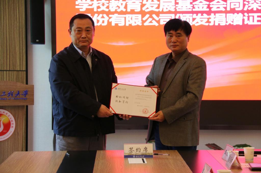 基金会秘书长邓新洲与朱立涛副总经理签订社会捐赠协议书。