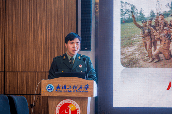 退役复学优秀员工代表王辰尧与同学们分享自己的部队经历、播放军旅生活视频,勉励同学们树立居安思危的国防观念,响应国家号召,积极投身于国防建设,把爱国之志转化为爱国之行。