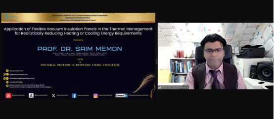 可再生能源工程首席执行官Saim Memon教授以“Application of Flexible Vacuum Insulation Panels in the Thermal Management of Electric Vehicles Batteries”为题作大会报告。Saim Memon教授围绕电动车电池的热管理问题展开,强调在极端气温条件下(如热干和冷干地区)保护电池舱的重要性,以维持电池性能、效率和寿命。介绍了利用柔性真空绝缘板(VIP)技术的工业研发成果,提供现实解决方案。