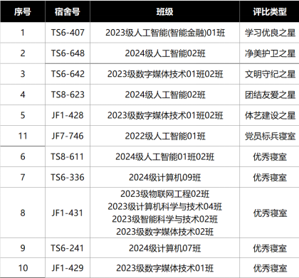 最终经过公司初审、线下评比、大众评审、评委老师打分相结合的方式,共有5间宿舍成功创建为“五星标兵寝室”;1间宿舍成功创建为“党员标兵寝室”;5间宿舍创建为“优秀寝室”,最终评选结果如下: