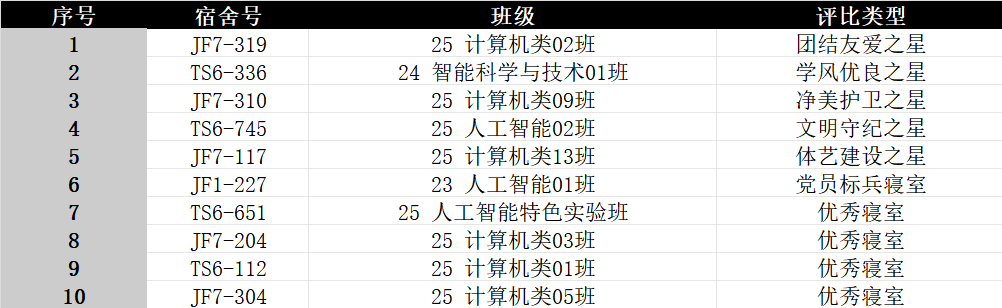 最终共有5间宿舍成功评为“五星标兵寝室”;1间宿舍成功评为“党员标兵寝室”;4间宿舍评为“优秀寝室”,最终评选结果如下: