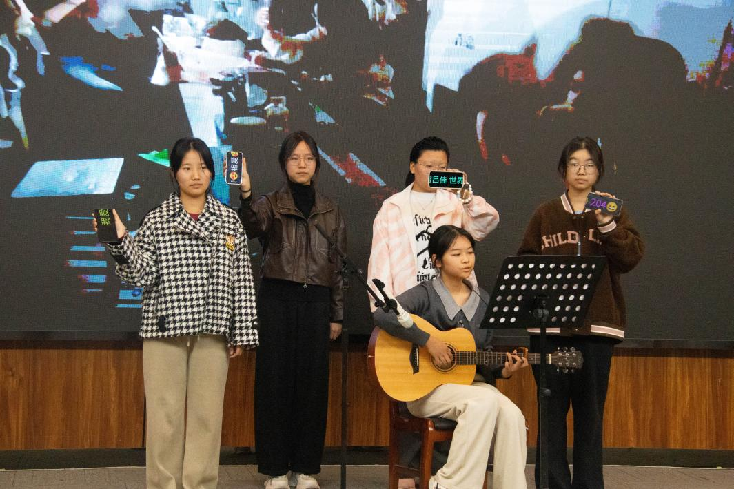 活动最后,应同学们的强烈要求,辅导员老师共同合唱歌曲《素颜》。他们用质朴的歌声诠释了“回归本真、拥抱真诚”的育人理念,展现了师生之间最纯粹的情感交流。这首充满青春记忆的歌曲引起了全场师生的共鸣,大家随着节奏轻轻跟唱,现场化作一片温馨的海洋。