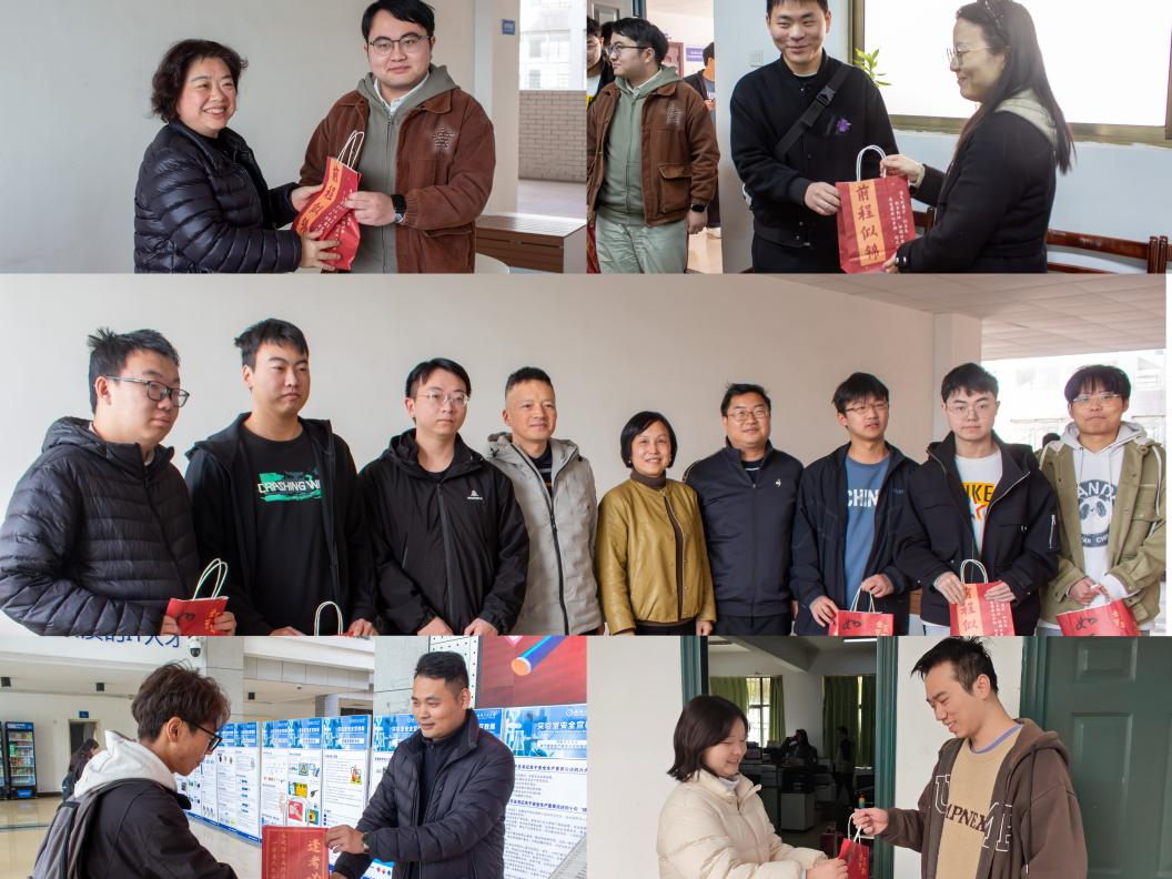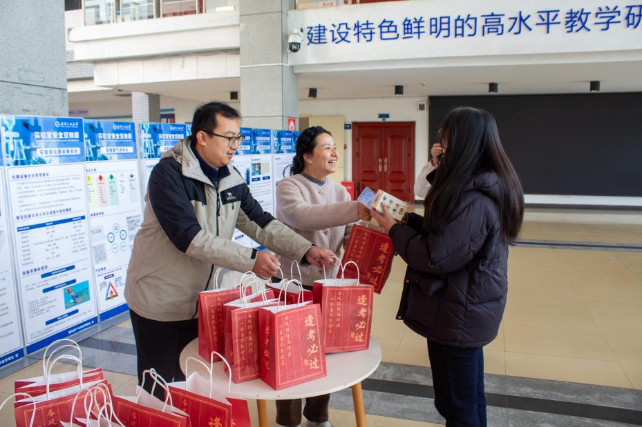 随后,老师们为学子们送上精心筹备的“逐梦上岸大礼包”。礼包中,上好佳鲜虾条寓意考研之路“佳”音频传,佳绩在望,为紧张备考增添美味动力;暖宝宝贴传递“寒冬暖身更暖心”的关怀,守护学子们安心复习不受严寒干扰;可乐则寄托“可喜可贺,一战成硕”的美好期许,愿大家卸下压力、从容应战。每一份礼包都承载着学院的深切关怀,让备考学子在冬日里感受到浓浓的暖意与力量。