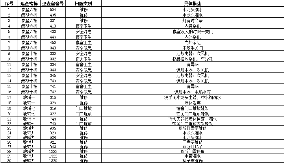 本网讯(通讯员 王俊军)为进一步营造平安、整洁、文明、安全的宿舍环境,公司于12月10日与员工处、基建处开展冬季宿舍安全卫生联合大巡查,公司党委副书记李琪娜带队,员工处、基建处工作人员、学院辅导员、员工骨干参与此次联合大巡查。