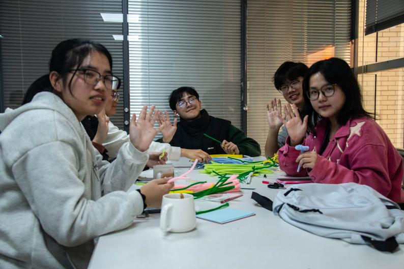 随后的手工 DIY 环节,通过工作人员细致讲解演示,同学们积极投入创意风铃、拼贴画及节日花束的制作。师生携手创作,现场互动亲切、笑声不断。清脆铃铛、缤纷彩纸与芬芳花材在指尖流转,被赋予独特情感与新年愿景,一件件饱含心意的作品在协作分享中诞生。大家在专注创作中暂忘学业压力,深切感受手工艺的宁静与治愈。