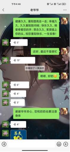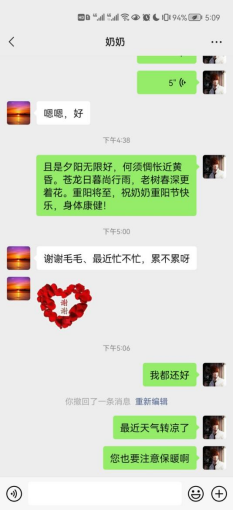 为了弘扬中华民族尊老孝亲、厚德仁爱的传统美德,学院的青年志愿者们同步开展了重阳节线上慰问家中老人活动。