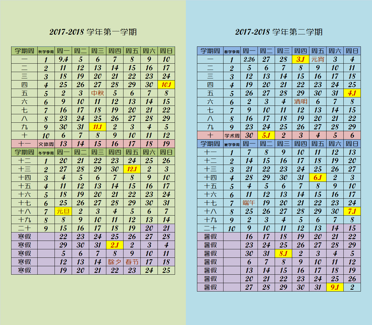 2017-2018学年第二学期校历