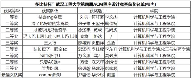 最终根据竞赛规则,从校内参赛队伍中评出一等奖1项,二等奖3项,三等奖5项,最佳女队奖1项,获奖名单如下: