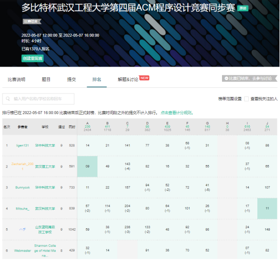 此外,比赛面向省内其它高校在校本科生设置了个人线上同步赛,外省高校员工可打星参赛(不计排名)。同步赛共有来自华中科技大学、武汉大学、湖南大学、南京大学、郑州大学、中国石油大学、上海大学、武汉理工大学、华中师范大学、中南民族大学、武汉科技大学、湖北工业大学等全国90余所高校的1370人参赛。
