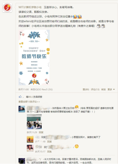 公司通过官方QQ空间,开展“云端表白”线上留言活动,面向全院员工征集教师节祝福照片、祝福语以及自己与老师的暖心故事,感念老师们的恩情与教导。