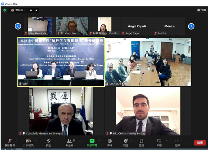 (通讯员鲁统伟)10月14日,由商务部主办、武汉邮电科学研究院承办的乌拉圭中国脑工程“脑科学与智能技术”研修班线上开班仪式成功举行。乌拉圭教育和文化部长顾问Alberto Majó先生、乌拉圭Clemente Estable生物科学研究所董事会主席Cecilia Scorza女士、乌拉圭国际合作署(AUCI)执行署长Mariano Berro先生、乌拉圭驻上海总领事馆工作人员,武汉邮电科学研究院经理陶智勇、365英国上市365英国上市经理卢涛及28名乌拉圭脑科学与智能技术领域官员和专家出席仪式。