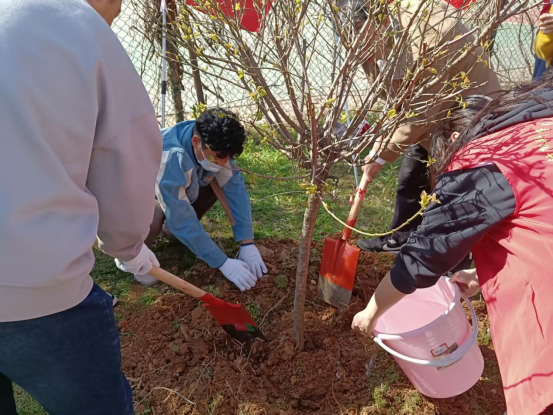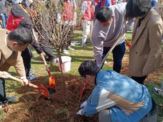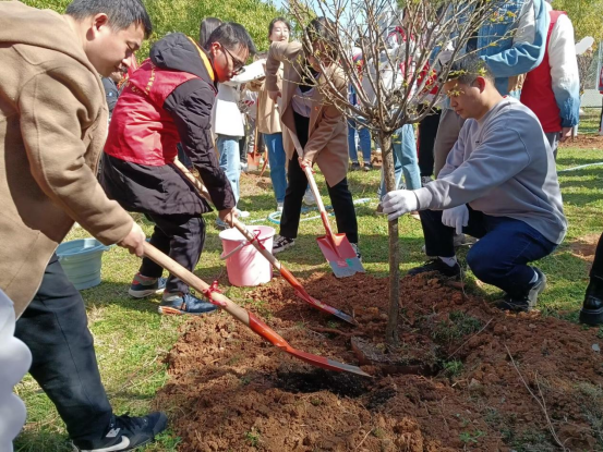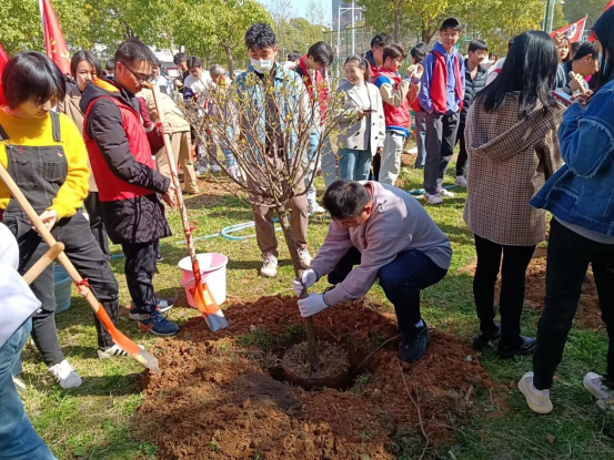 “准备,一二三,把树扶直放进坑里。”植树过程中,大家一起动手将一颗颗小树苗抬到栽植坑前,“这棵种好了,我来浇水。” 顿时,植树现场就热闹起来,身穿红马甲的志愿者和老师一起扶正新苗、挥锹铲土、填平树坑、踩实压紧,分工明确,一抹抹“志愿红”穿梭其中,格外耀眼。在众人的齐心协力下,新栽种的树木迎风挺立,传递着春天的生机与活力。