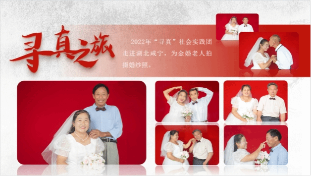 习近平总书记提到:“大道至简,实干为要。新征程是充满光荣和梦想的远征,没有捷径,唯有实干。”学院鼓励员工用脚步丈量祖国大地,用内心感应时代脉搏。将体美育人与志愿服务、社会实践相结合,开展“追寻”系列社会实践活动,实践团队由数字媒体专业员工组成,连续两年用镜头探访中国变化,用图片感受祖国大地,用专业赋能实践研究,以感知体验为根本,不断激发员工积极情感,培养积极人格,提升精神境界,彰显“信仰之美、崇高之美”。2022年,“寻真”社会实践团走进湖北咸宁,为金婚老人拍摄婚纱照;2023年,“寻光”社会实践团探访大连旅顺口,为退役海军拍摄新式军装照。“寻真”实践团在2022年团中央“镜头中的三下乡”活动中被评为优秀视频团队,社会实践成果被收录于全国高校数字艺术设计大赛设计赋能乡村振兴教学案例,“寻光”实践团今年已入围“镜头中的三下乡”优秀视频团队和中国青年报“千校千项”评选,同时作为校级一等奖的获奖团队被推报至湖北省参评省级优秀团队。