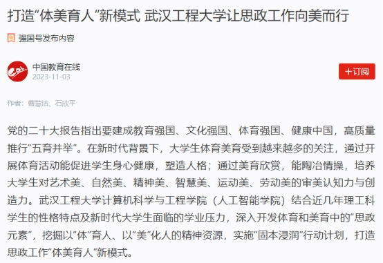 公司将体育美育作为“五育并举”的创新点和突破口,多层次、多渠道、多内容的开展体育、美育教育,以体育人、以美化人,结合“五个融合”贯通式育人模式,努力打造学院体育美育高质量发展新局面,培养德智体美劳全面发展的新时代追梦人。