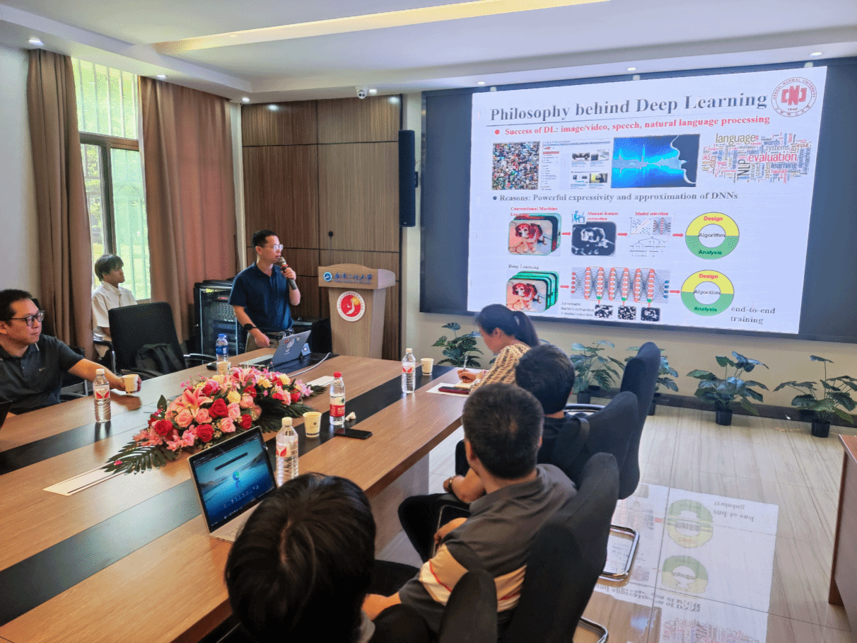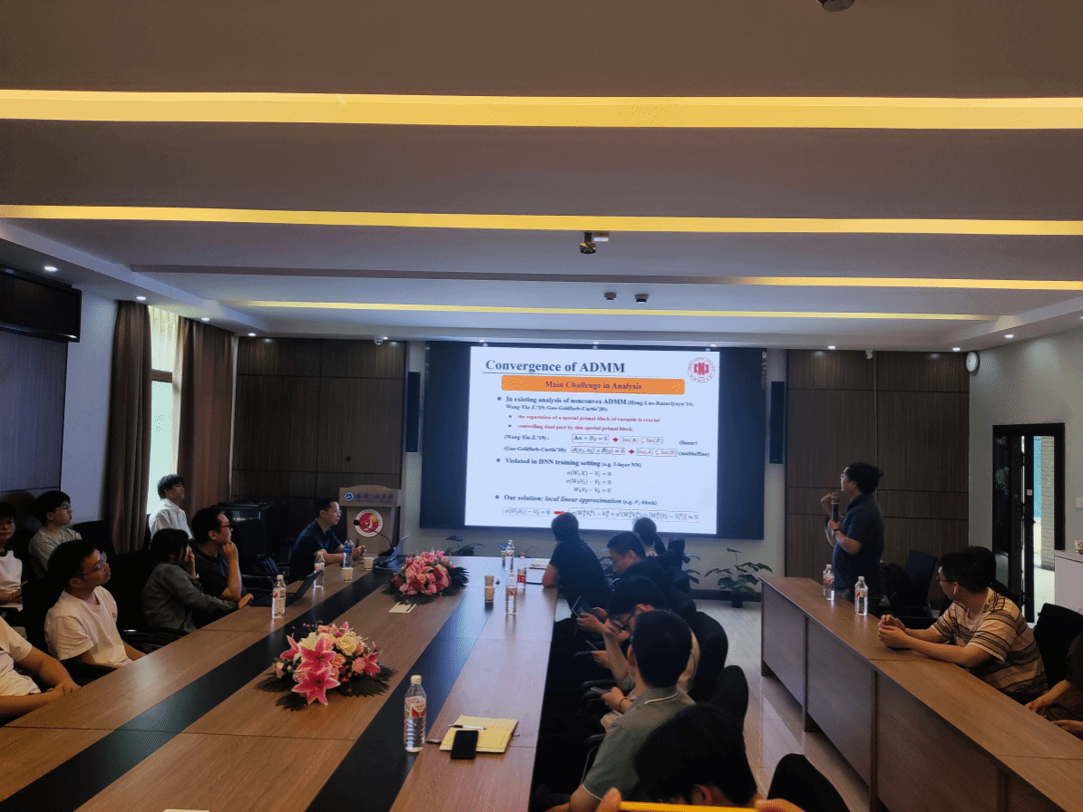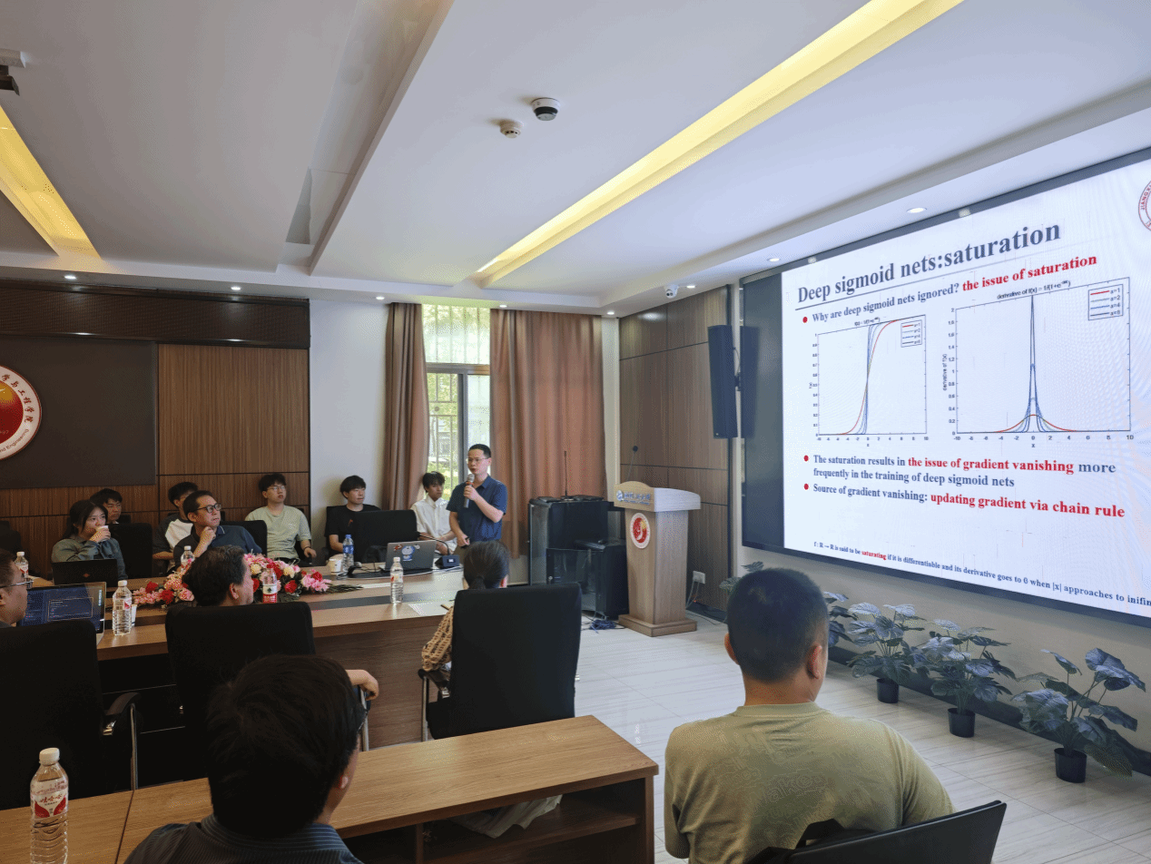 曾锦山教授作了题为“On ADMM in Deep Learning: Convergence and Saturation-Avoidance”的学术报告,他首先介绍了深度学习在大数据时代的重要性,讨论了传统学习过程中的挑战。接着,深入探讨了深度sigmoid网络与深度ReLU网络在逼近能力上的理论比较,证明了深度sigmoid网络在某些函数类上的逼近能力不逊于深度ReLU网络。在深度sigmoid网络训练的过程中,饱和问题导致的梯度消失问题更加频繁,而梯度消失的根源是用链式法则更新梯度,以此提出了ADMM算子,并讨论了算法在实际深度学习训练中的稳定性和超参数调整的便利性。