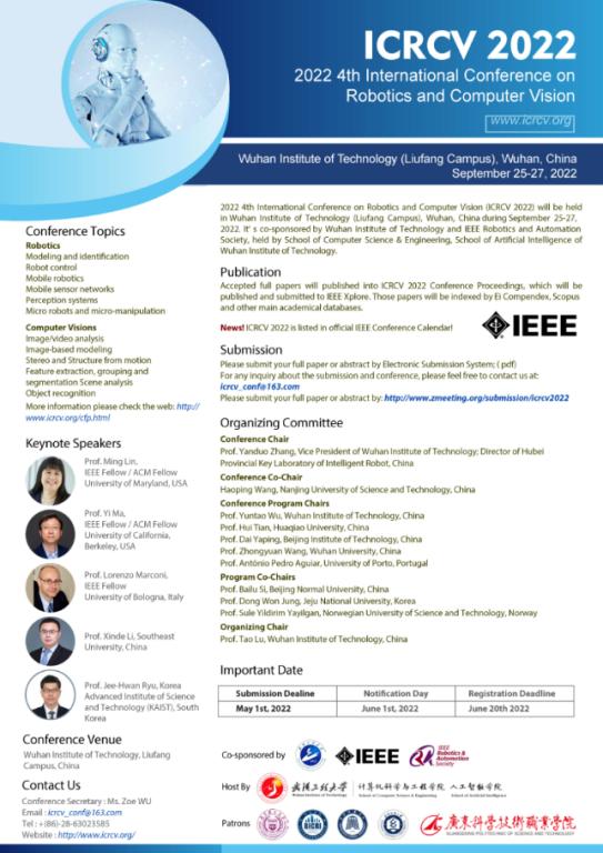 本次会议所有文章将由程序委员会严格审核,录用文章在完成注册后将被收录至ICRCV 2022会议论文集,由IEEE出版,并提交Ei核心和Scopus检索。文章作者将被邀请到武汉参会并展示研究报告。