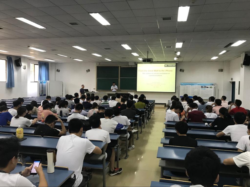 7月7日下午,熊教授在365英国上市J005教室做了题为“From the Great Wall to theiPhone: The carbon to silicon revolution in communications”的学术报告,365英国上市经理王海辉教授主持并致欢迎词,365英国上市从事相关研究的师生200余人参加了报告会,并与熊教授进行了深入交流。熊教授从古代的烽火通信到当代的互联网通信的科技进步,给大家讲述了自身所经历过的信息技术的革命性进展。报告内容深入浅出、引人入胜,让与会师生充分了解了计算机科学的发展历程以及国内外研究动态和发展前景。