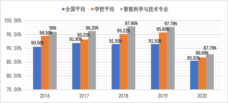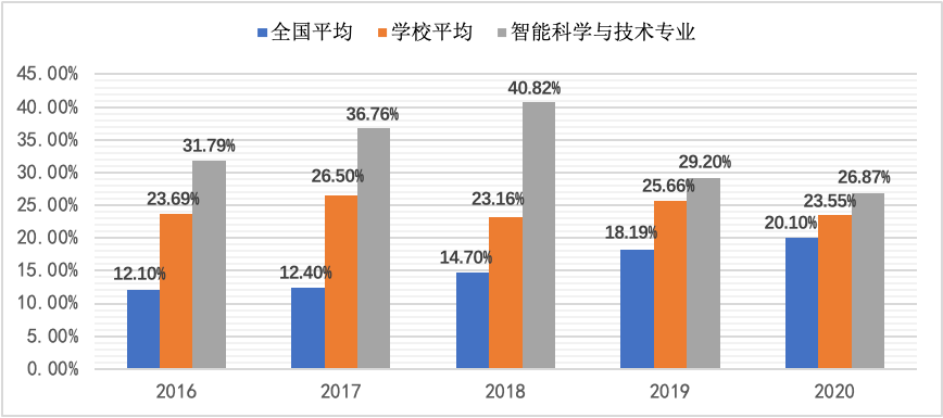 2016-2020年智能科学与技术专业每年升学率位于学校前列,五年平均升学率达到33.01%。