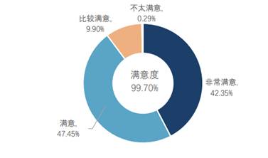用人单位对学院人才培养的满意度为99.7%,其中,“非常满意”占比42.35%,“满意”占比47.45%,“比较满意”占比9.9%,位于学校前列。